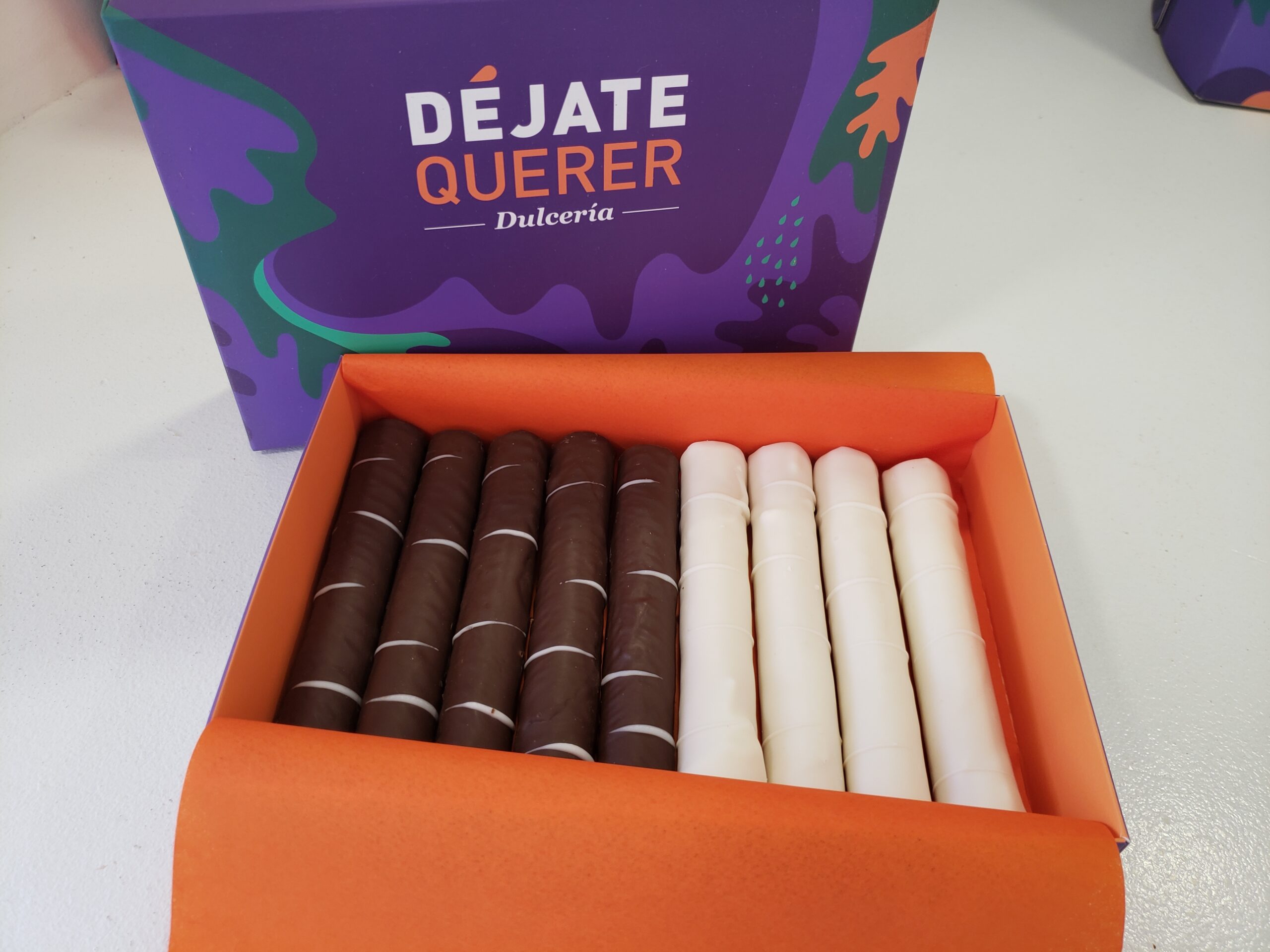 Caja contiene 18 unidades de cuchufli gourmet relleno dulce de leche, barquillos totalmente bañados en chocolate por dentro y por fuera (barquillo13 cm aprox). Caja lleva 9 unidades de dulce de leche cubierto con chocolate negro y 9 unidades de dulce de leche cubierto con chocolate blanco.