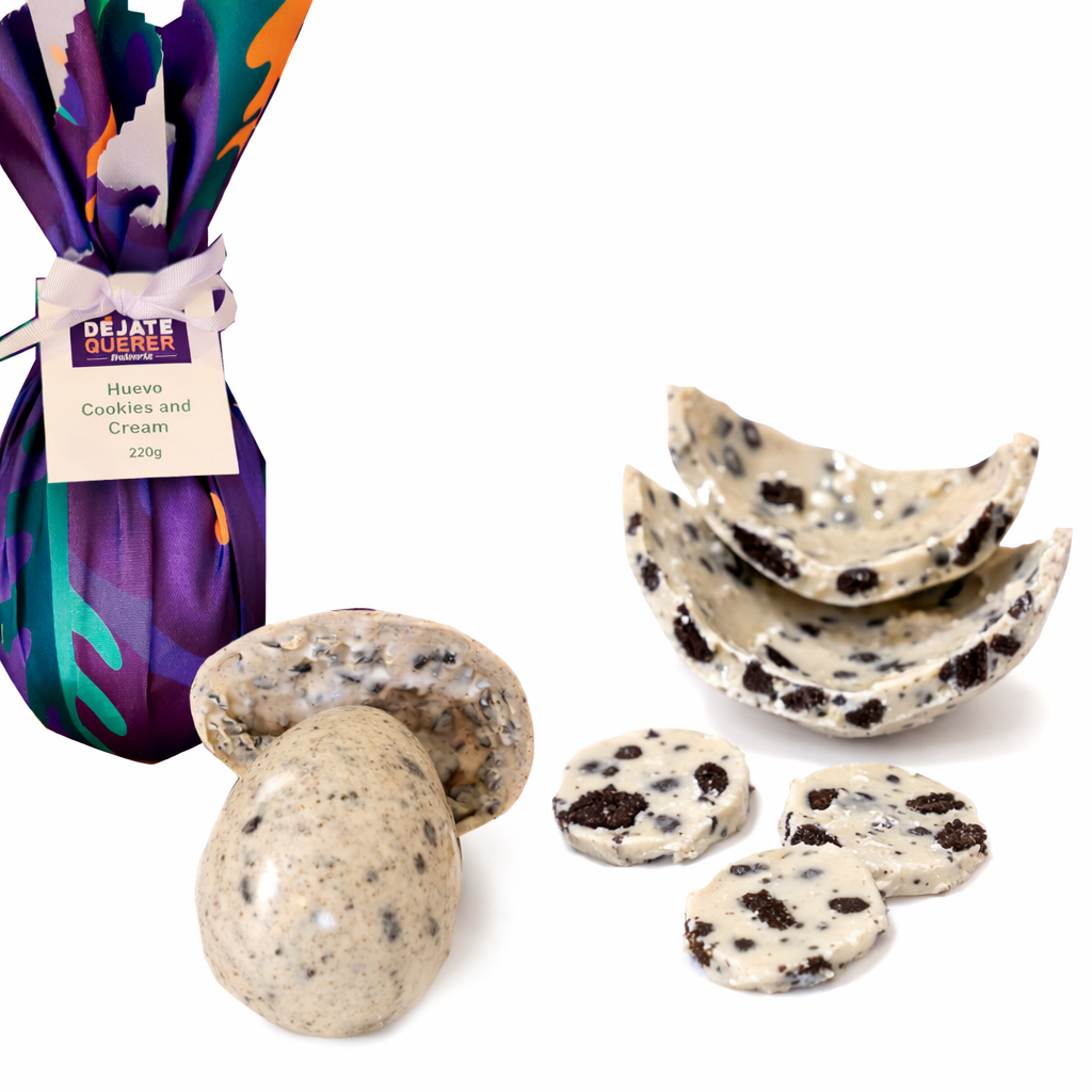 Huevo cookies and cream es hecho con chocolate blanco y galleta oreo. En su interior contiene monedas de chocolate blanco con pedazos de galleta oreo. Peso total 170g.