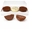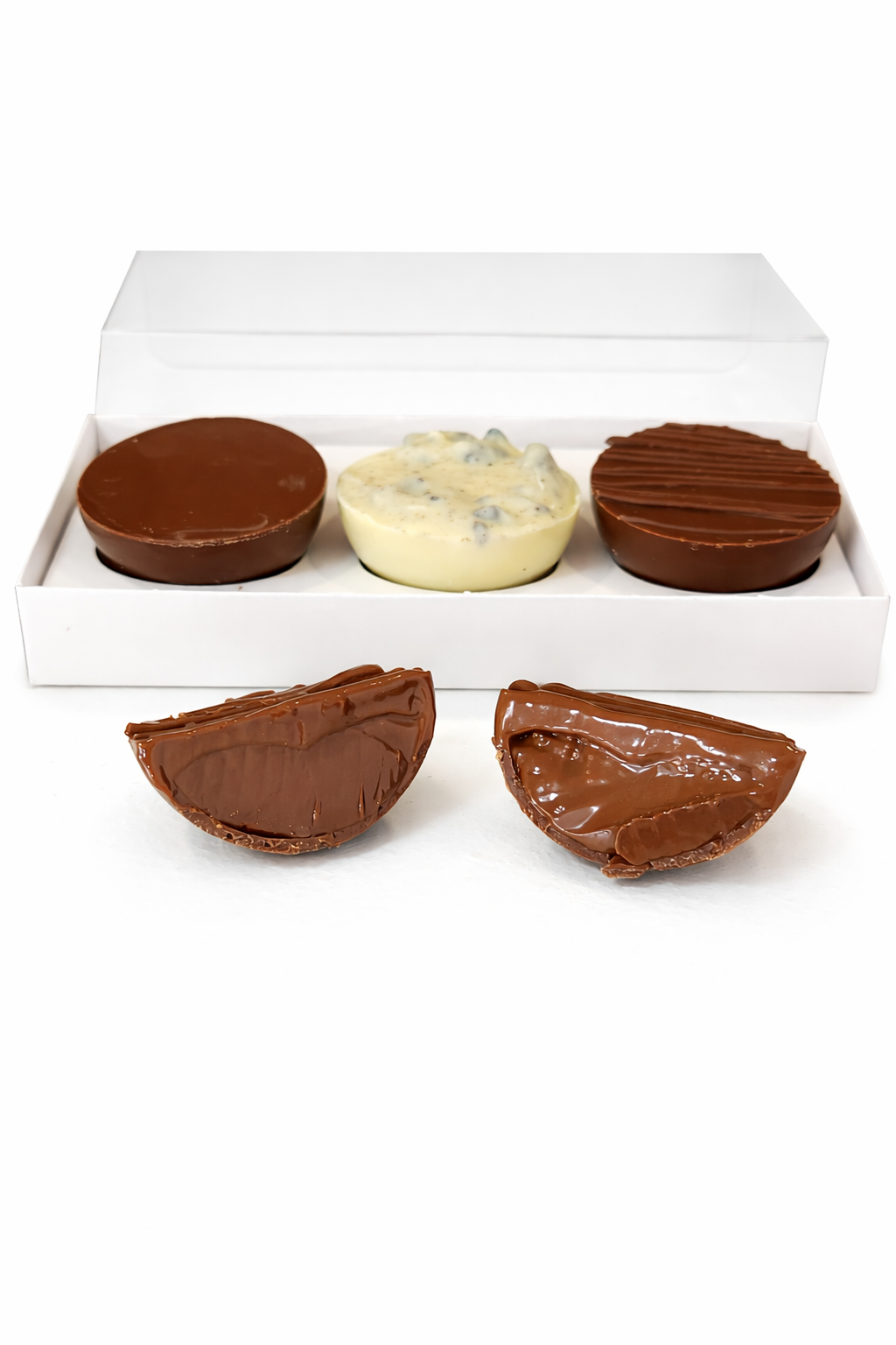Dos unidades en chocolate leche 40% cacao(uno relleno con nutella y otro con dulce de leche) y una unidad de huevo cookies con chocolate blanco relleno de nutella. Los huevos miden 6cmx4cm.