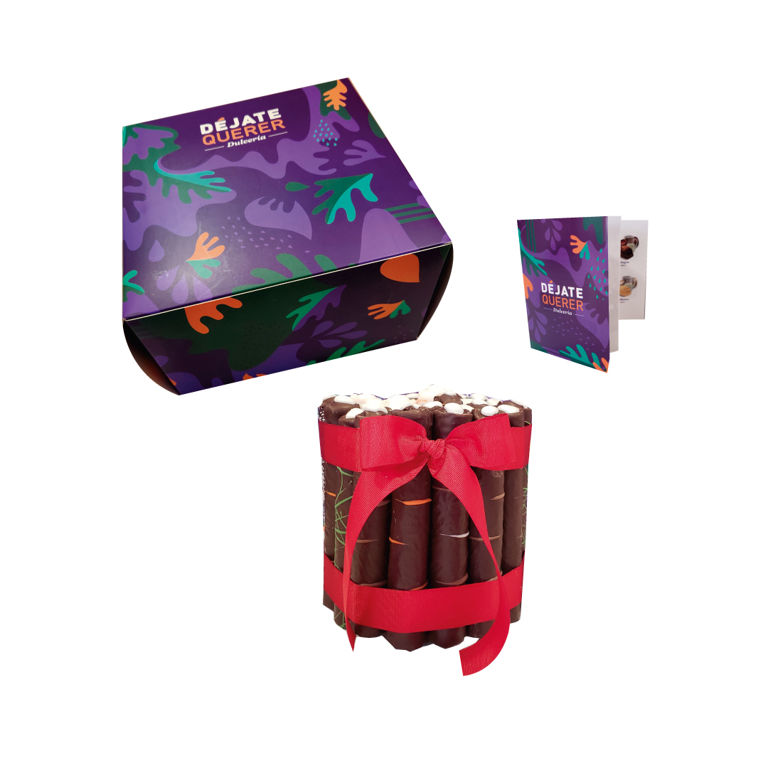 Torta contiene 25 unidades de cuchufli gourmet, barquillos totalmente bañados en chocolate por dentro y por fuera rellenos con diferentes sabores (barquillo 13 cm aprox). Esa torta lleva al menos 13 sabores entre ellos pistacho, Lúcuma, naranja, chocolate, coco, Irish cream, Turamisú, frambuesa, entre otros. El color de la cinta es rojo o dorado de acuerdo a la disponibilidad. Acompaña catálogo de sabores.