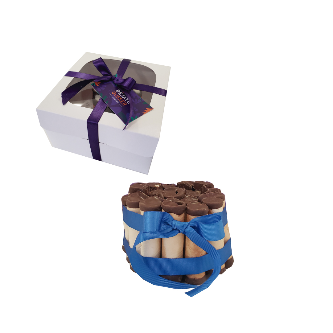 Torta contiene 20 unidades de mini barquillos rellenos de Nutella (barquillo 6,5 cm aprox). Son bañados en chocolate en su interior y en las puntas. Su durabilidad son 15 días. Cinta color roja. Es una torta chica.
