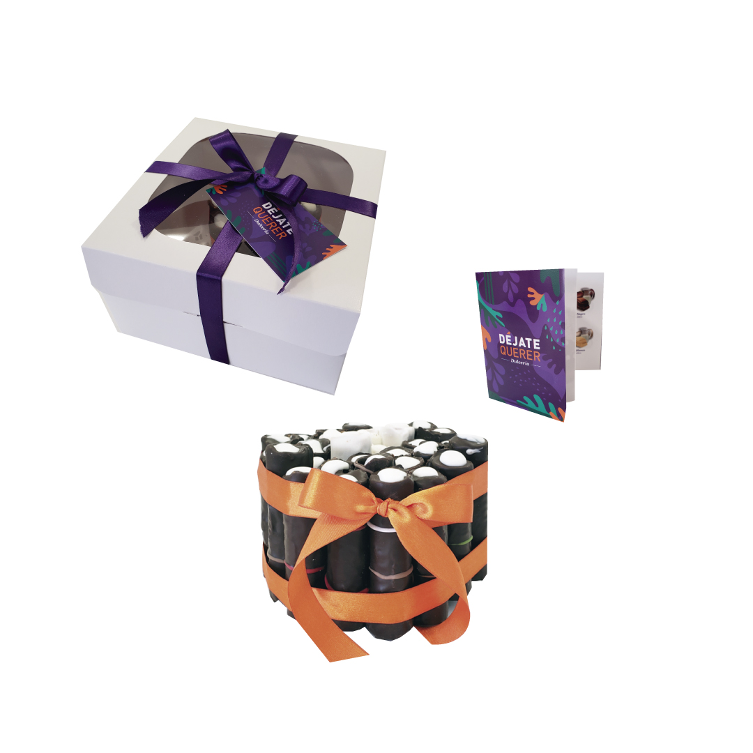 Torta contiene 20 unidades de mini cuchufli gourmet, barquillos totalmente bañados en chocolate por dentro y por fuera rellenos con diferentes sabores (barquillo 6,5 cm aprox). Esa torta lleva al menos 13 sabores entre ellos pistacho, Lúcuma, naranja, chocolate, coco, Irish cream, Turamisú, frambuesa, entre otros. El color de la cinta es rojo o dorado de acuerdo a la disponibilidad. Acompaña catálogo de sabores. Es una torta chica.