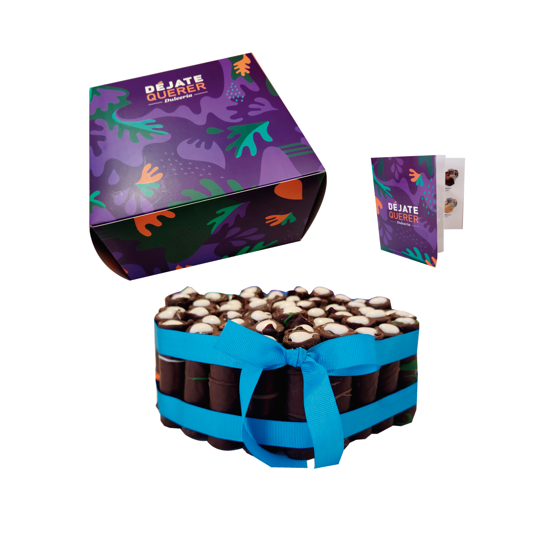 Torta contiene 60 unidades de mini cuchufli gourmet, barquillos totalmente bañados en chocolate por dentro y por fuera rellenos con diferentes sabores (barquillo 6,5 cm aprox). Esa torta lleva al menos 13 sabores entre ellos pistacho, Lúcuma, naranja, chocolate, coco, Irish cream, Turamisú, frambuesa, entre otros. El color de la cinta es rojo o dorado de acuerdo a la disponibilidad. Acompaña catálogo de sabores.
